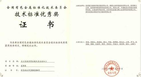 昆明理工大学分析测试研究中心杨喜昆正高级工程师作为主要起草人,参与由昆明富尔诺林科技发展有限公司、潍柴火炬科技股份有限公式、昆明理工大学等多家单位联合编制的《点火电极用贵金属及其合金加工材》国家标准,2024年10月30日荣获2024年全国有色金属标准技术委员会技术标准优秀奖二等奖。